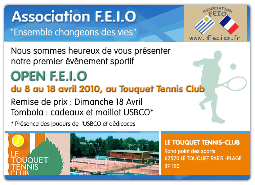 La saison sur terre battue reprend pour les amateurs de tennis. En effet, l'Open FEIO aura lieu du 8 au 18 avril 2010 au Touquet Tennis Club. Cette année l'association FEIO sponsorise et dynamise l'événement. N'hesitez pas à vous inscrire peu importe votre niveau avec la petite balle jaune! Aussi, l'association organisera à l'occasion une tombola au soir de la remise des prix (dimanche 18 avril) faisant gagner des maillots de football de l'équipe de Boulogne sur mer (ligue 1) remis par les joueurs qui seront présents pour cette fête.